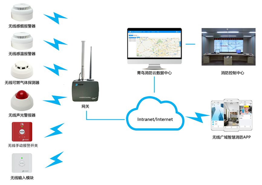 采用基于物聯(lián)網(wǎng)技術(shù),運(yùn)用云計(jì)算、大數(shù)據(jù)的全新智慧防火系統(tǒng)解決方案,在建筑物內(nèi)配備健全的物聯(lián)網(wǎng)化的消防設(shè)備,實(shí)時(shí)在線監(jiān)測(cè)現(xiàn)場(chǎng)消防設(shè)備的運(yùn)行情況,可將所有火警信息通過(guò)有線或4G網(wǎng)絡(luò)(由于校園網(wǎng)通常為內(nèi)部專網(wǎng),網(wǎng)關(guān)無(wú)法自動(dòng)獲取IP地址,因此推薦網(wǎng)關(guān)選擇4G作為上行信道)直接上傳至青鳥消防云平臺(tái),平臺(tái)將報(bào)警信息通過(guò)手機(jī)APP、電話、短信等方式及時(shí)通知相關(guān)負(fù)責(zé)人,便于消防隱患及時(shí)處置,能夠真正的提高校園消防安全管理的能力,有效防范火災(zāi)事故的發(fā)生,極大程度地保障校園學(xué)生的生命和財(cái)產(chǎn)安全。